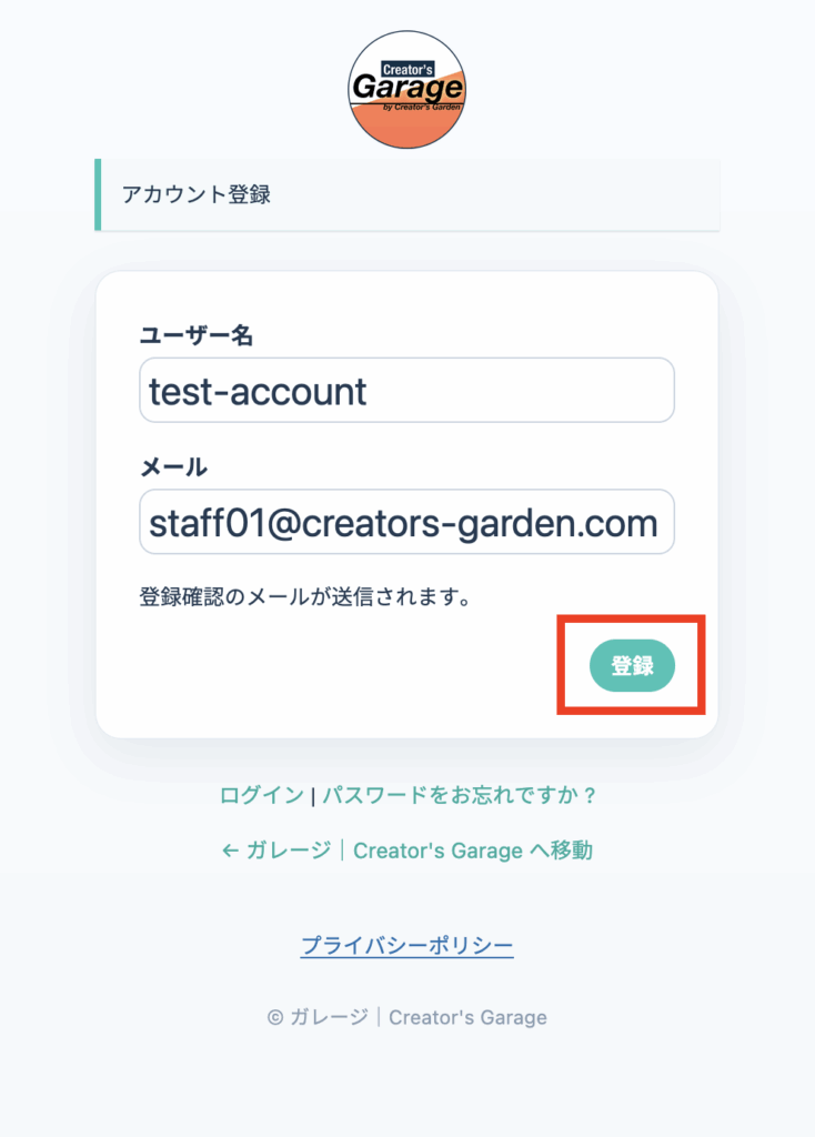 ② ユーザー名とメールアドレスを入力し、「登録」します。