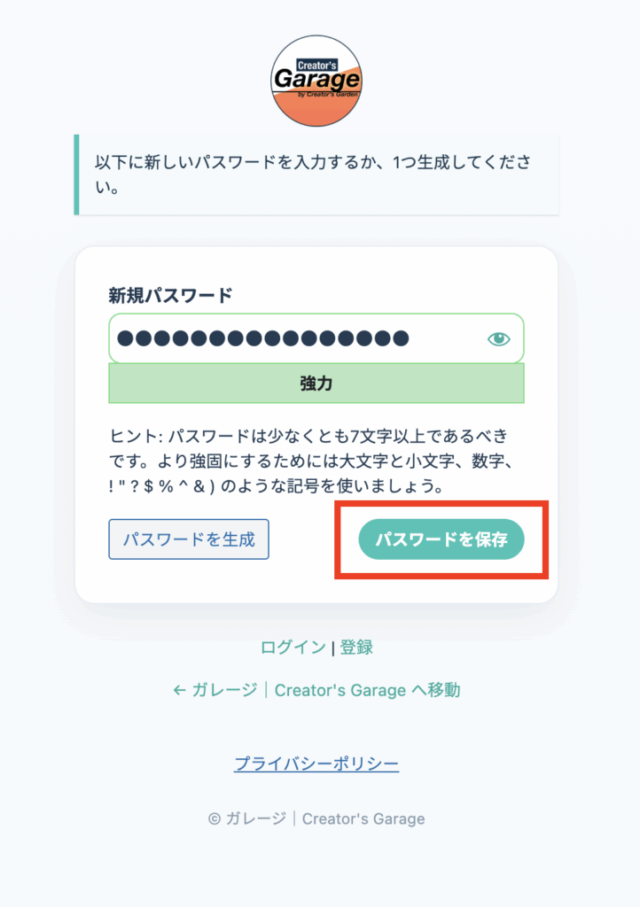 パスワードを設定し、「パスワードを保存」をクリックしてください。